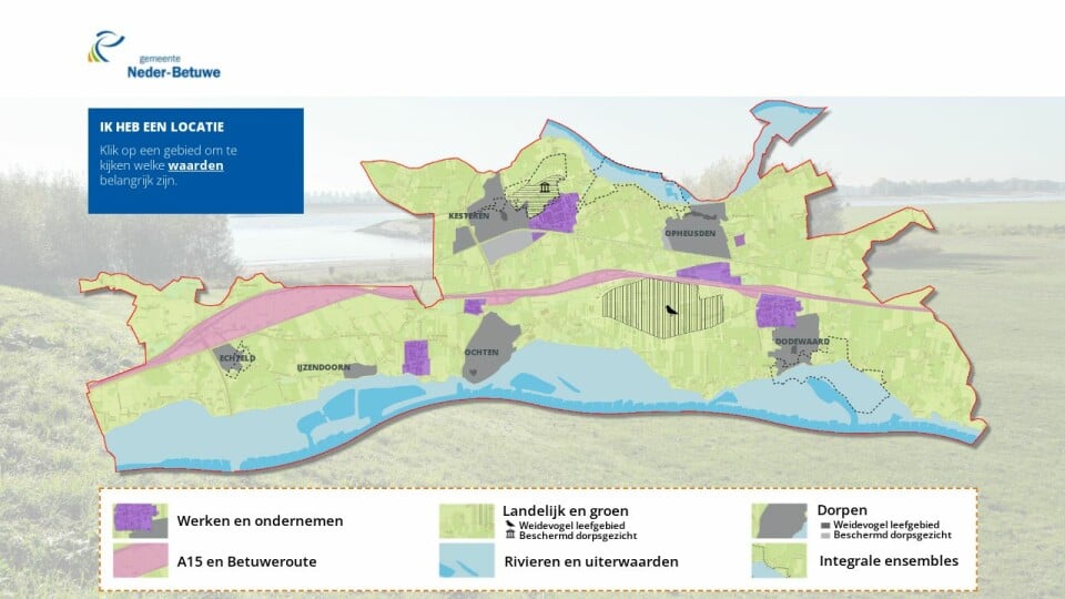 De gemeente vindt het belangrijk dat plannen zo worden vormgegeven dat ze aansluiten bij de waarden van een gebied. Door op een gebied te klikken komen de waarden in beeld. Daarnaast worden voorbeelden gegeven van plannen die bij het karakter van het gebied passen.
